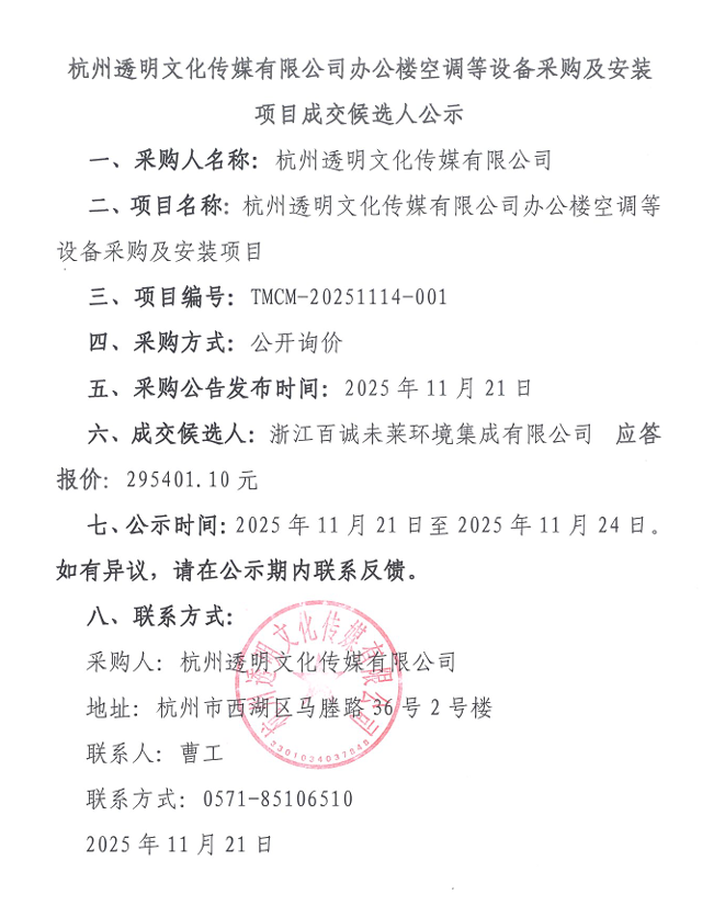 杭州透明文化传媒有限公司办公楼空调等设备采购及安装项目成交候选人公示一、采购人名称:杭州透明文化传媒有限公司