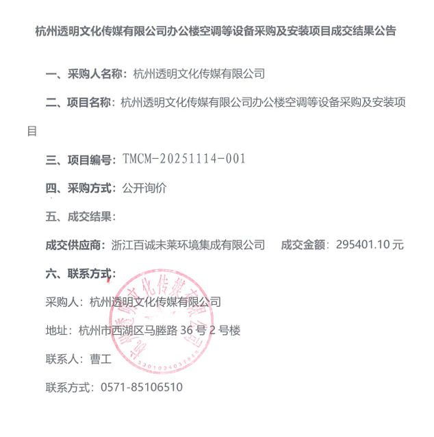 杭州透明文化传媒有限公司办公楼空调等设备采购及安装项目