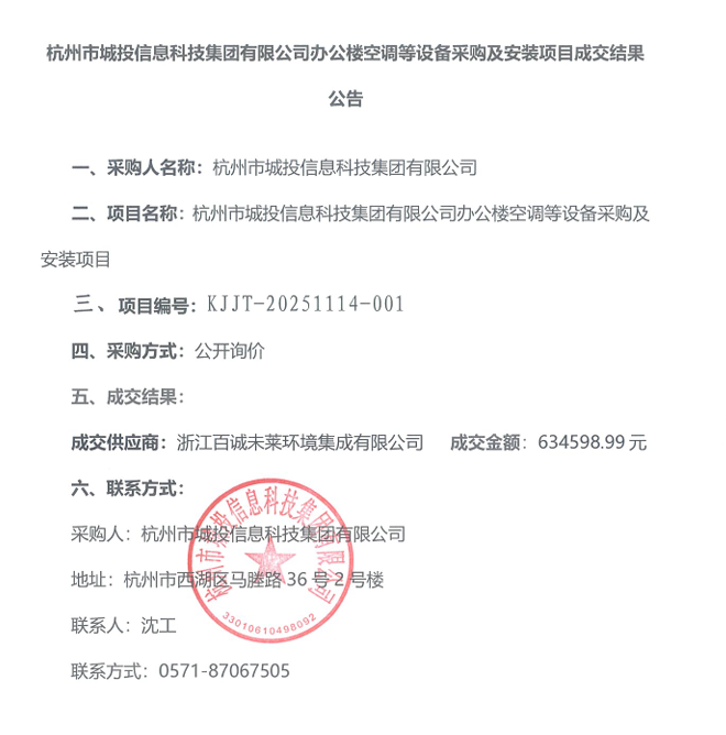 杭州市城投信息科技集团有限公司办公楼空调等设备采购及安装项目成交结果公告一、采购人名称:杭州市城投信息科技集团有限公司